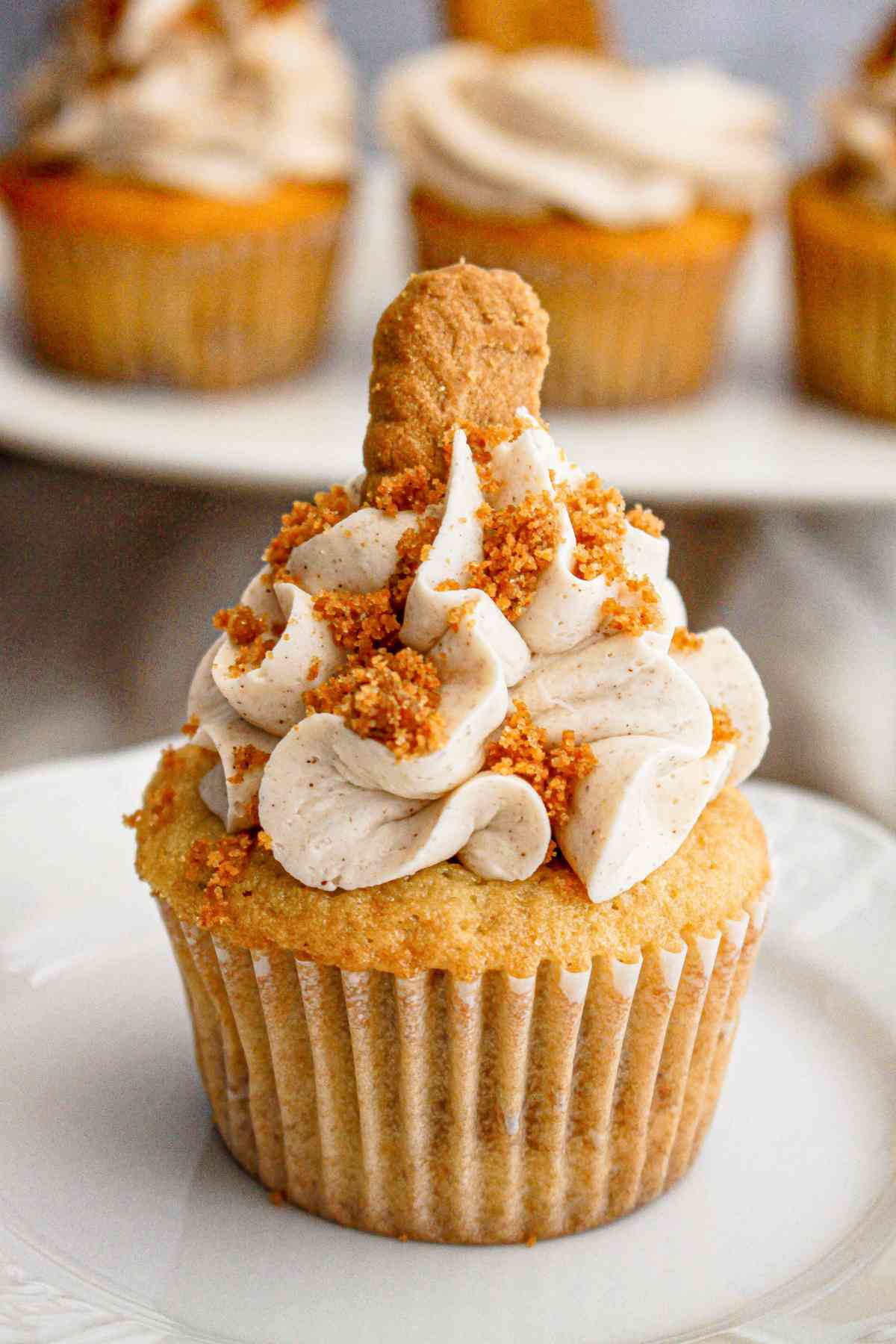 - Sprinkle leftover cookie crumbs or half of a Biscoff cookie on top of the cupcakes.