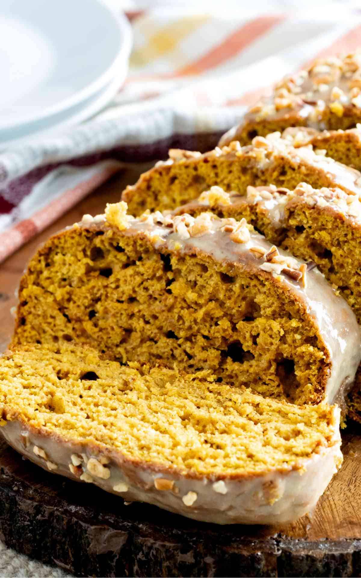 These iced pumpkin spice loaves are a fantastic addition to any fall potluck or office party during pumpkin season. Each bread loaf can be sliced into 12 individual slices and can be frozen.