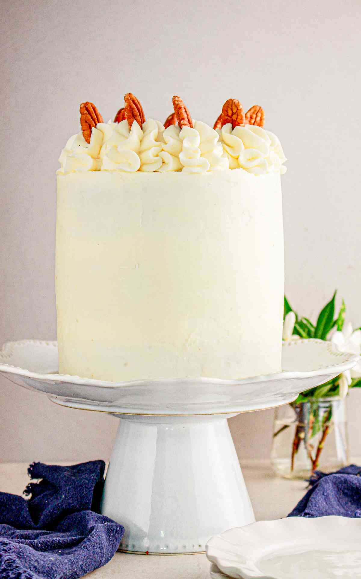 - If desired, pipe extra swirls on top of the cake and place pecans on each peak. Slice and enjoy!