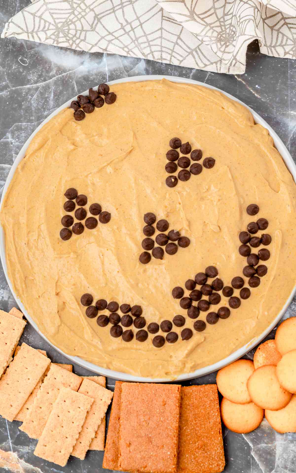 - Spread into a circular serving dish and decorate with chocolate chips to form a Jack-O'-Lantern face.