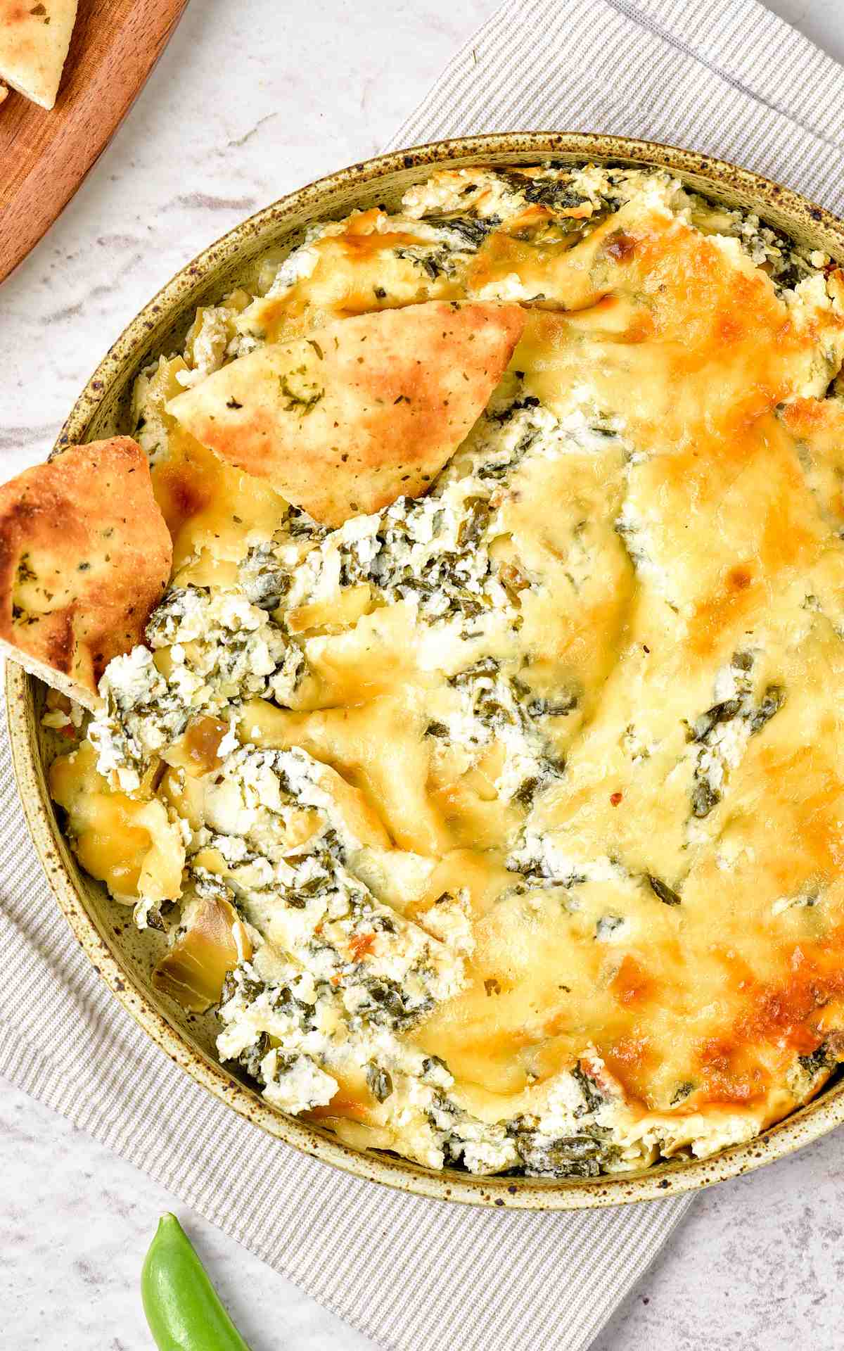 Spinach artichoke dip is best served hot right out of the oven when the cheese is still bubbling and the top layer is lightly golden. Set the baking dish on the table with tortilla chips, pita chips, or slices of a loaf of crusty bread and it quickly becomes the first thing everyone reaches for.