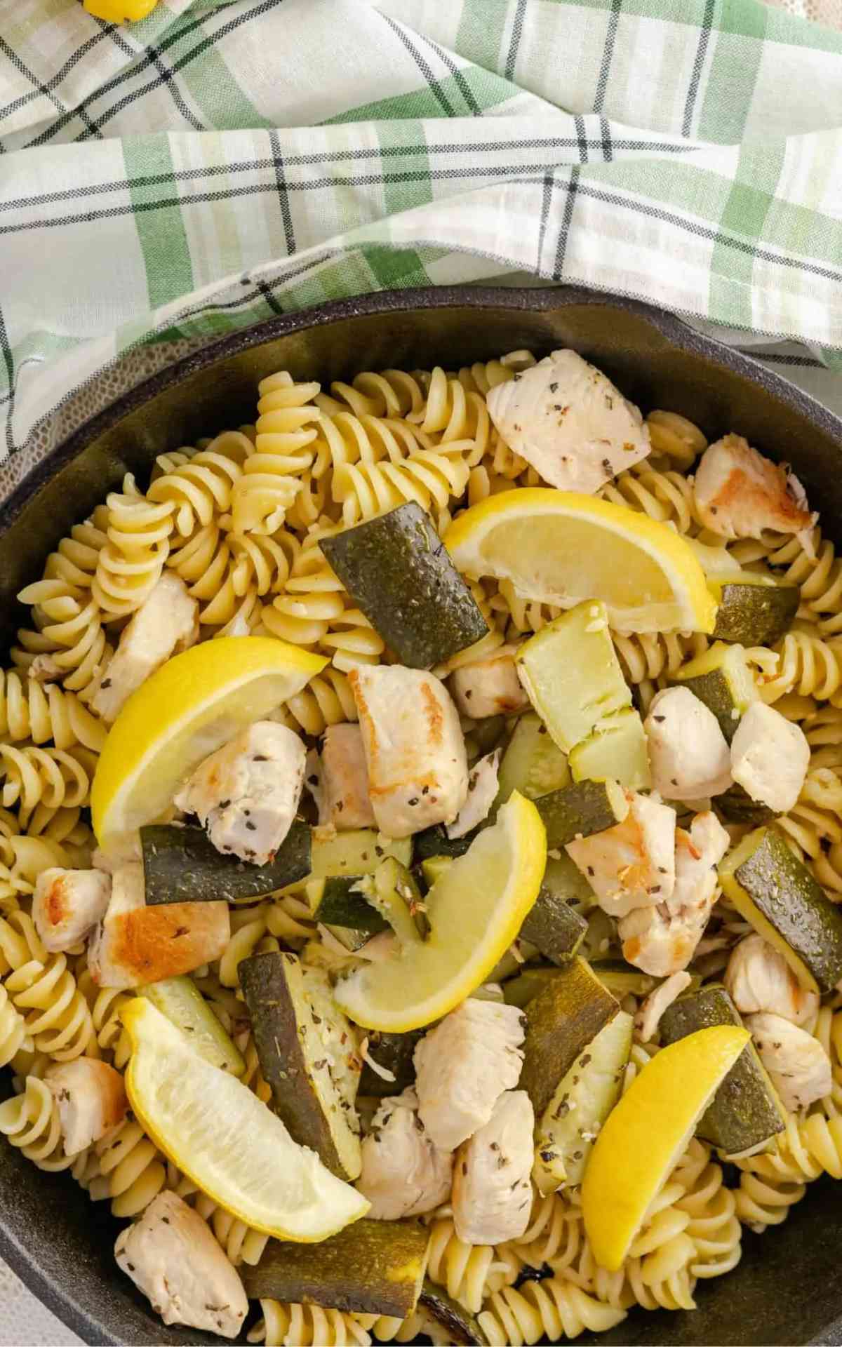 Enjoy a simple and tasty meal with this Chicken Zucchini Pasta Skillet, featuring chicken, zucchini, lemon, rotini pasta, and basil.